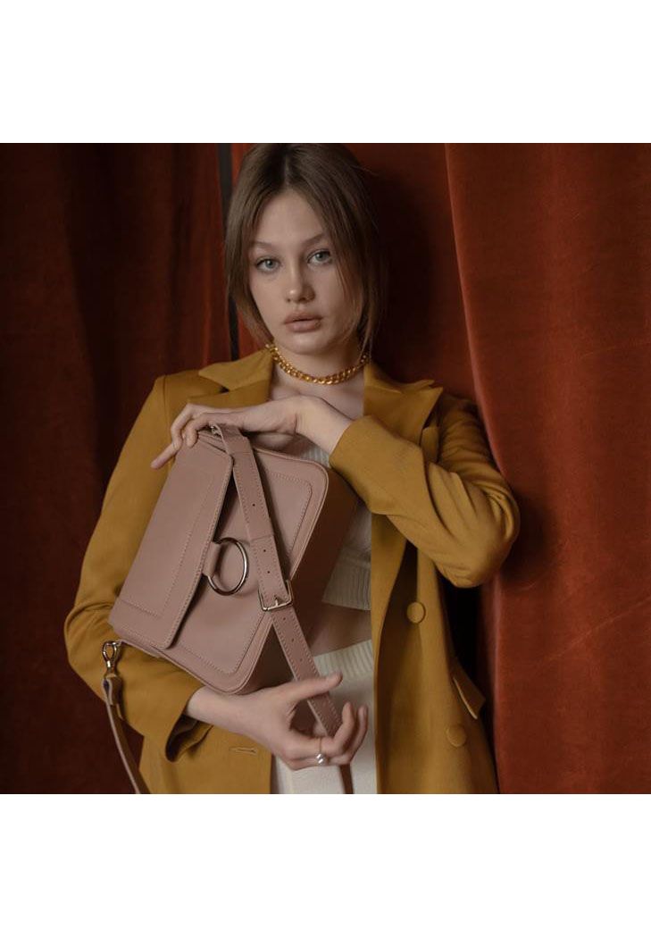 Классическая сумка с ярким акцентными кольцом, разбавляет сдержанные формы.