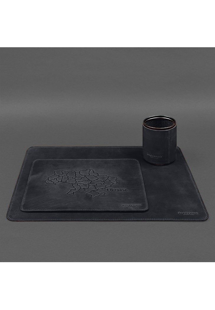 Коврик под ноутбук защитит поверхность любого стола от царапин и потертостей, которые могут появляться в процессе работы. Кожаный коврик для мышки увеличивает точность наведения курсора, улучшает скольжение и предотвращает появление царапин на нижней части корпуса устройства, а также на столе. Украшен коврик тиснением в виде контуров карты Украины. Кожаный стакан, предназначенный для хранения карандашей, различных ручек и других канцелярских принадлежностей также будет очень кстати.